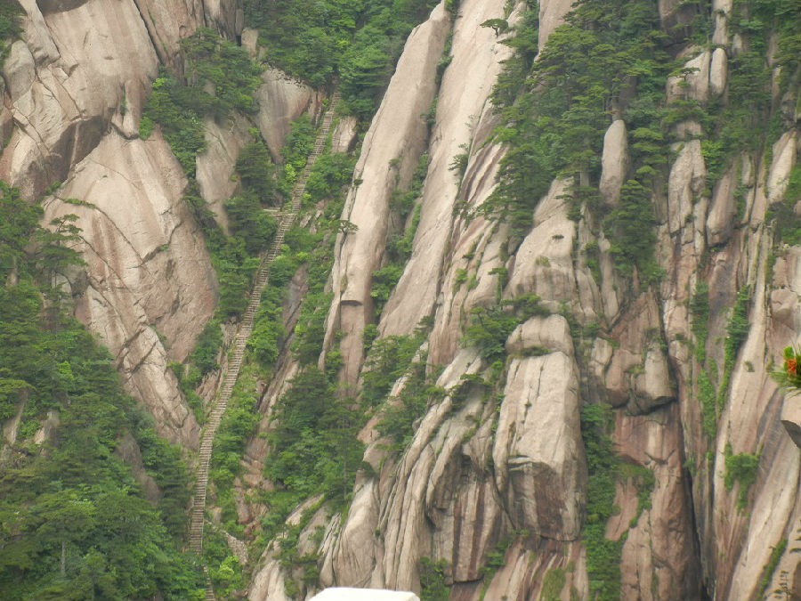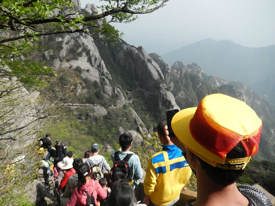 看過上圖,不知幾個(gè)人還能睡得好,雖然白天爬山太累??本人也本著之前去過一次黃山,認(rèn)為黃山的風(fēng)景還是很秀麗的,所以在今年5.1又帶家人去了一次,由于過節(jié)太擠了,索道太難等了,全家都是從云谷索道爬上去的,因?yàn)槲胰ミ^一次,所以就由我?guī)ьI(lǐng)家人從以前走過的線路走的.本以為這次也帶家人看一看黃山在書中所寫的半山寺外抬頭見,展翅金雞叫道衢;登上龍?bào)椿厥锥?,扶肩五老上天?/span>的風(fēng)景,可惜月份去得太早了點(diǎn),樹也才發(fā)芽,葉子都還沒有長出來,最難受的那就是人太多,一路是走走停停,不遠(yuǎn)的路都要走比平時(shí)多幾倍的時(shí)間.
