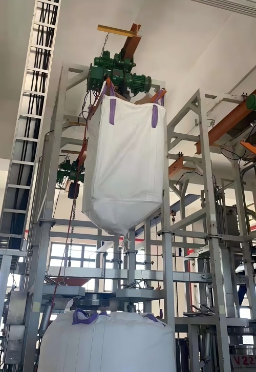 噸包拆包機采用設備自帶的電動葫蘆、叉車、行車進行物料提升,有效降低了人工勞動強度,拆包處理量大,400KG~3T均可。